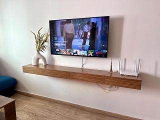 Het appartement heeft 1 slaapkamer, een flatscreen-tv en een volledig uitgeruste keuken met een koelkast, een oven, een wasmachine, een magnetron en een kookplaat.